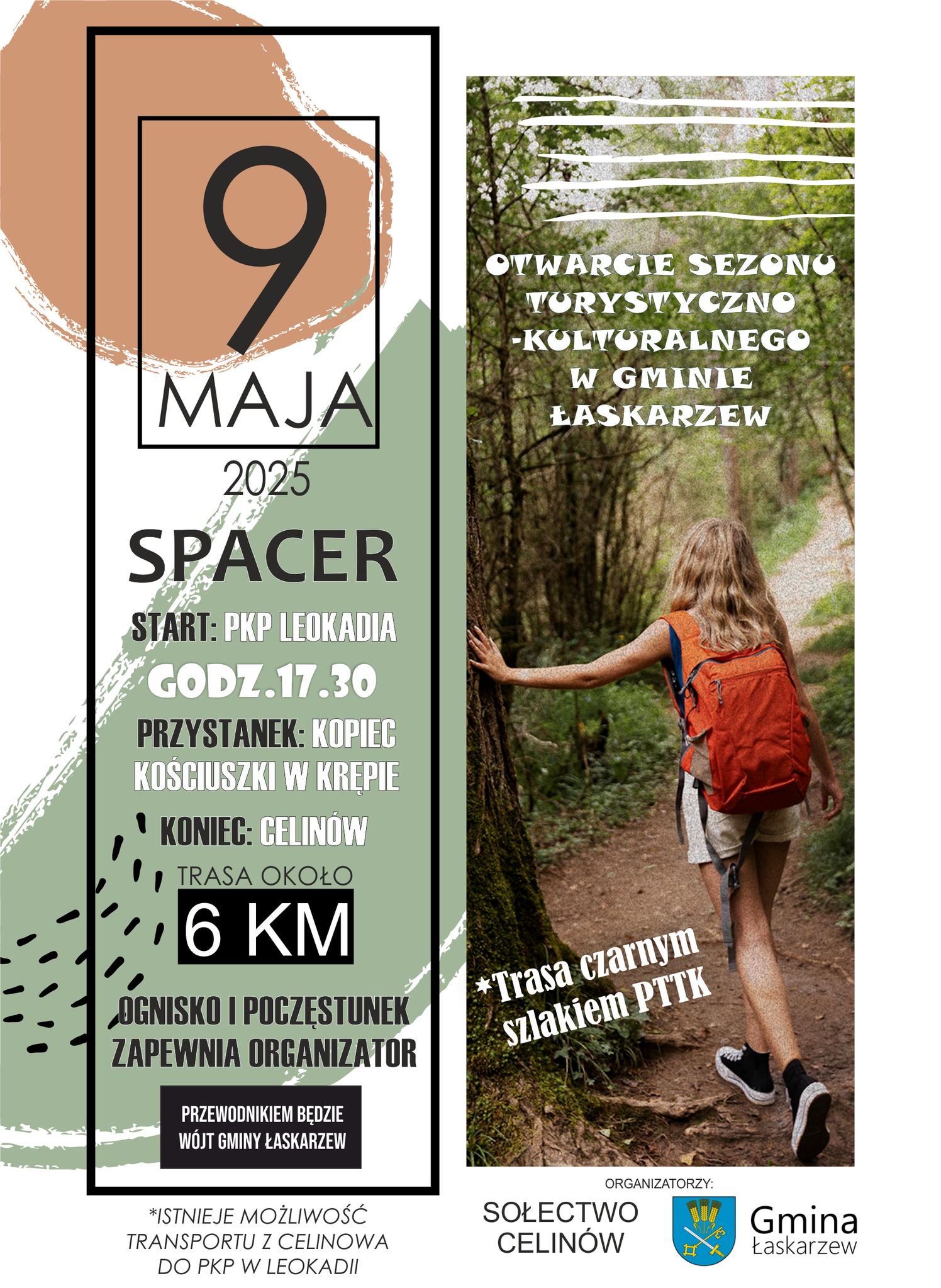 Gmina Łaskarzew wraz z Sołectwem Celinów zaprasza wszystkich miłośników aktywnego wypoczynku na pieszą wycieczkę, która odbędzie się w piątek, 9 maja. Uczestnicy spotkają się o godzinie 17:30 przy stacji PKP Leokadia, skąd wyruszą czarnym szlakiem PTTK na około 6-kilometrową trasę przez malownicze lasy w kierunku Kopca Kościuszki w Krępie.