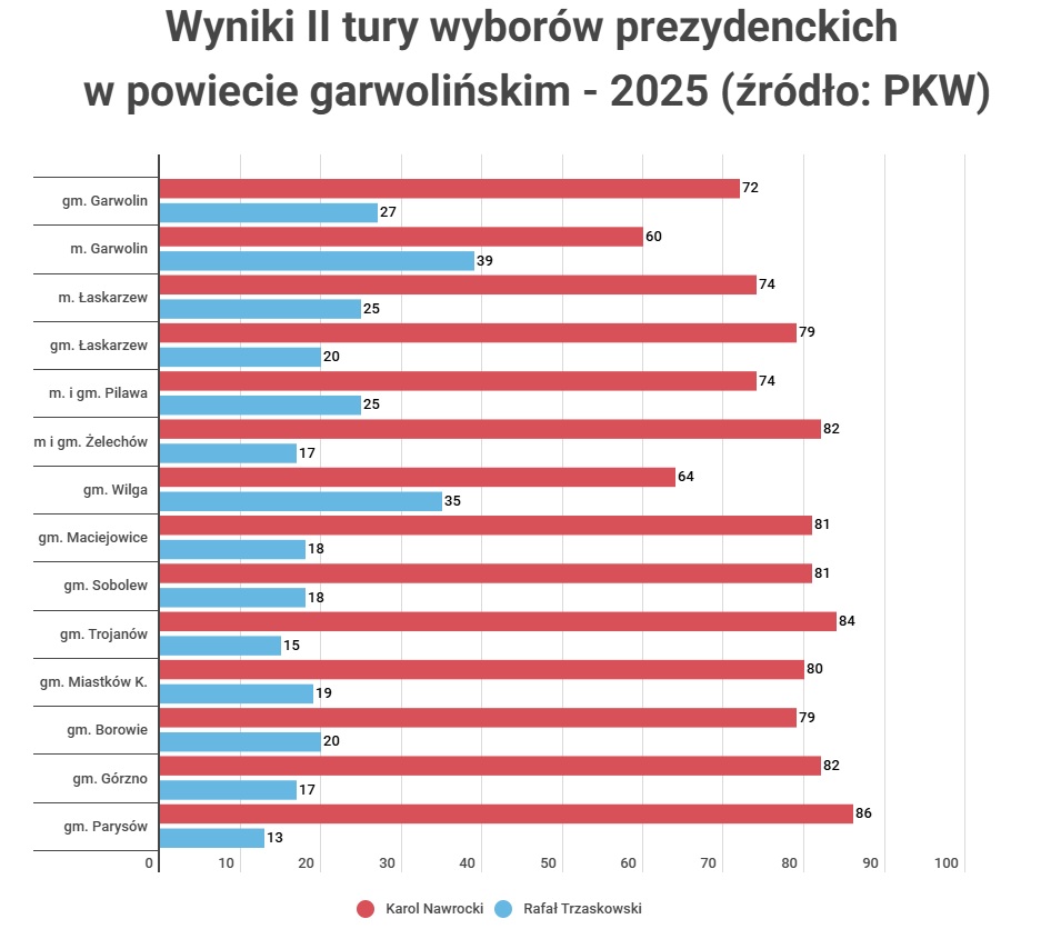Nowy prezydent największym poparciem cieszył się w gminach Parysów (86,09%), Trojanów (84,21%) i Górzno (82,76%). Karol Nawrocki zebrał najmniej głosów tam gdzie wygrał Rafał Trzaskowski. Na prezydenta Warszawy zagłosowało 39,50% mieszkańców Garwolina, 35,44% mieszkańców gminy Wilga i 27,34% mieszkańców gminy Garwolin.