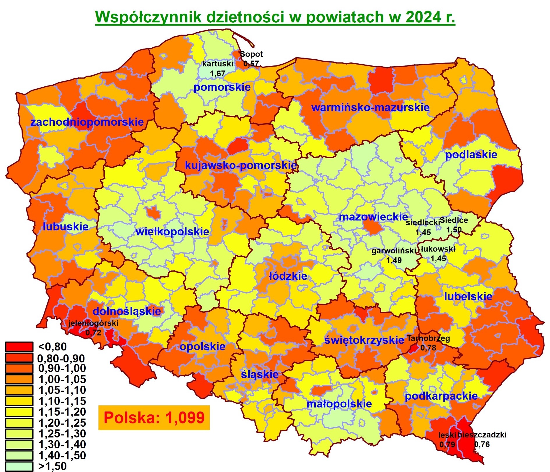 Wyżej uplasowały się jedynie miasto/powiat Siedlce (1,50) i nieznacznie wyprzedzający nas powiat. Dla porównania, średni współczynnik dzietności w Polsce wyniósł zaledwie 1,099, a najsłabszy wynik zanotowano w Sopocie (0,57).