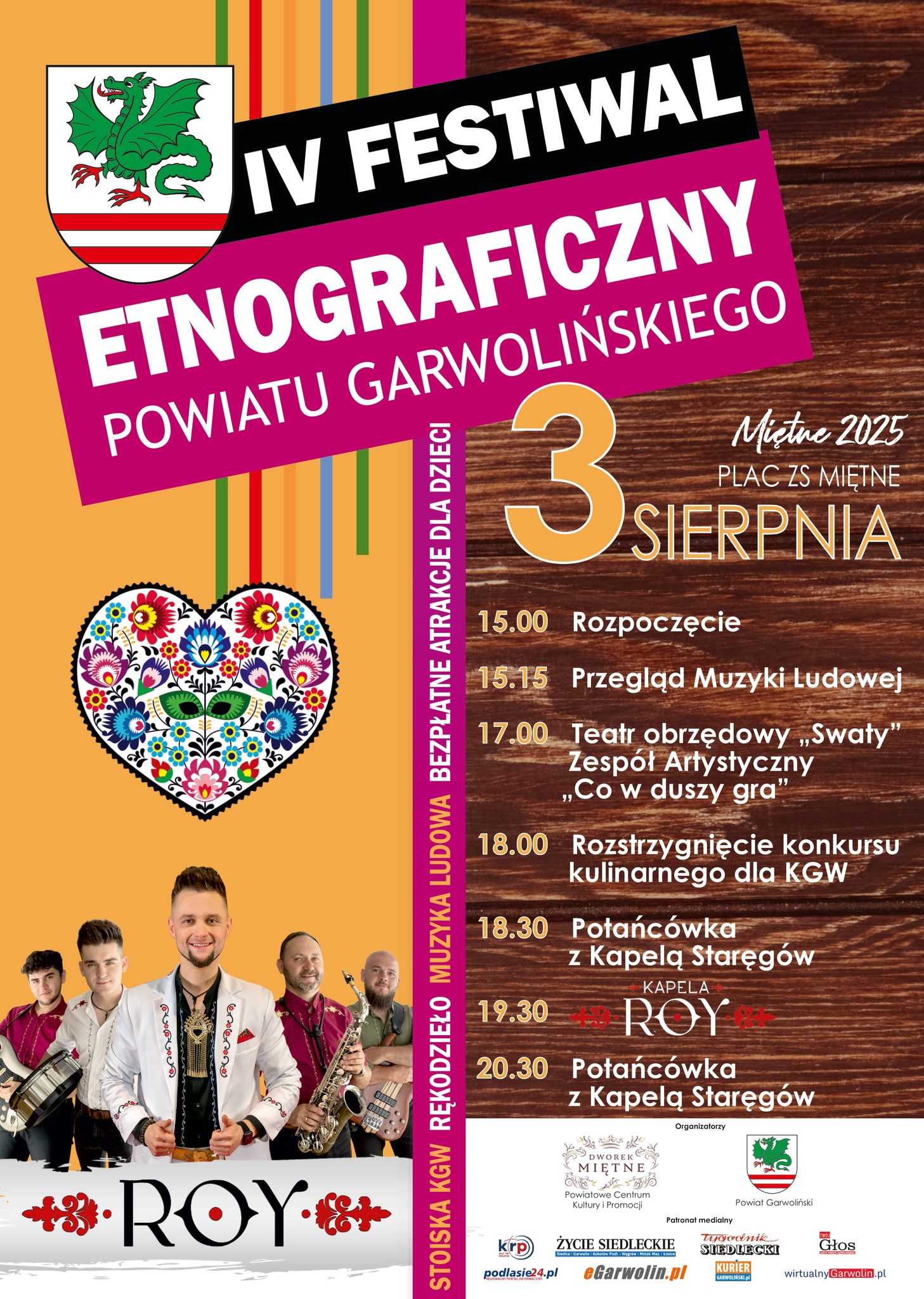 Plac Zespołu Szkół w Miętnem zamieni się tego dnia w prawdziwe centrum kultury ludowej. Na uczestników czekają bezpłatne atrakcje dla dzieci, stoiska z wyrobami rękodzielniczymi, występy artystyczne i wieczorne potańcówki z Kapelą Starego oraz zespołem ROY.