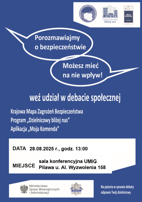 28 sierpnia br. o godz. 13 w sali konferencyjnej Urzędu Miasta i Gminy Pilawa odbędzie się ewaluacyjna debata społeczna. Główny temat spotkania to bezpieczeństwo mieszkańców miasta i gminy. Wydarzeniu będzie przyświecało hasło „Razem dla Bezpieczeństwa – głos Mieszkańców, działania Policji”.