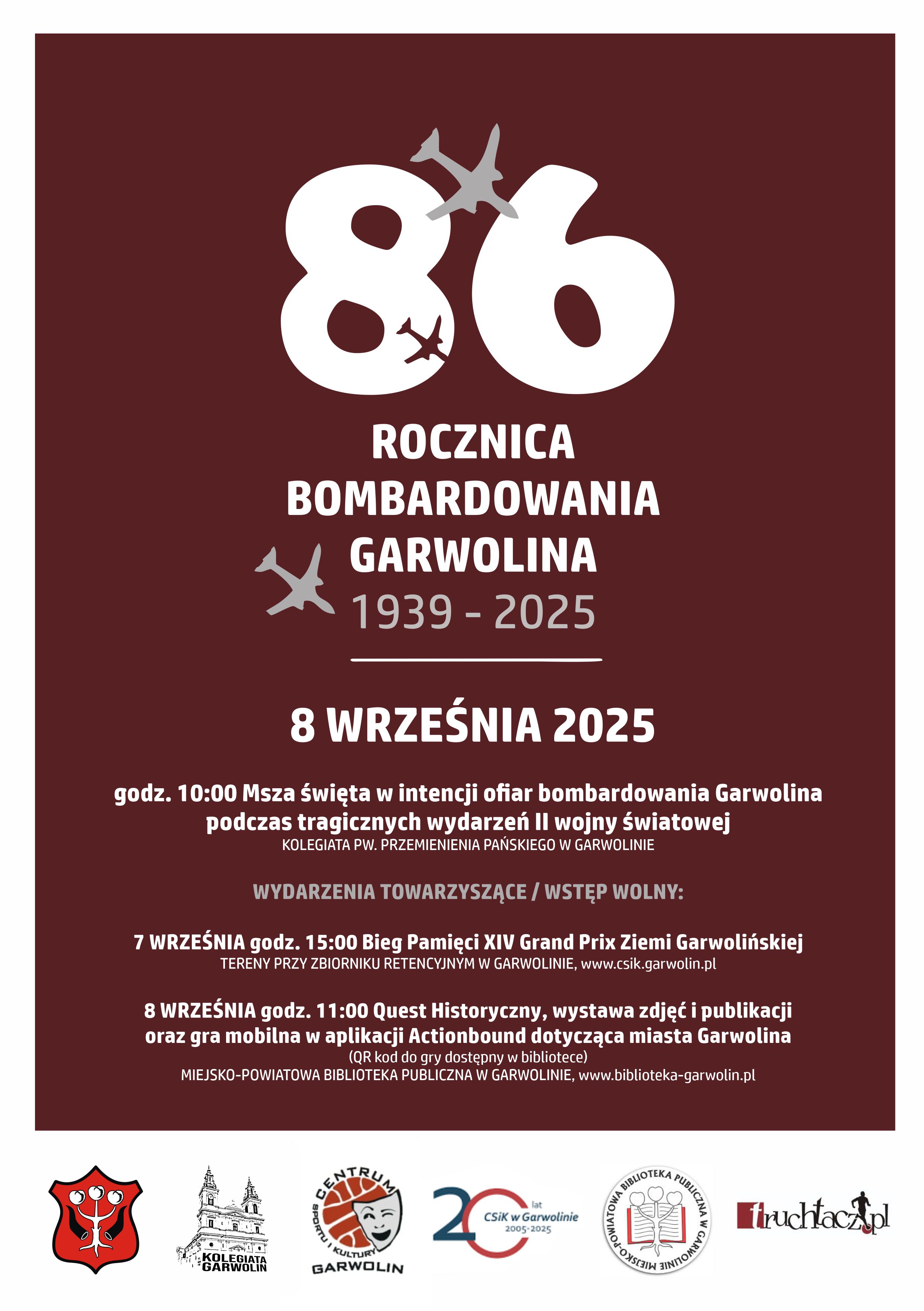 W 86. rocznicę bombardowania Garwolina, 8 września o godzinie 10:00 w Kolegiacie Przemieniania Pańskiego w Garwolinie odprawiona będzie msza święta w intencji poległych i pomordowanych w czasie II wojny światowej mieszkańców Garwolina. Uroczystość ta będzie chwilą zadumy i modlitwy za tych, którzy stracili życie w czasie wojennych działań.