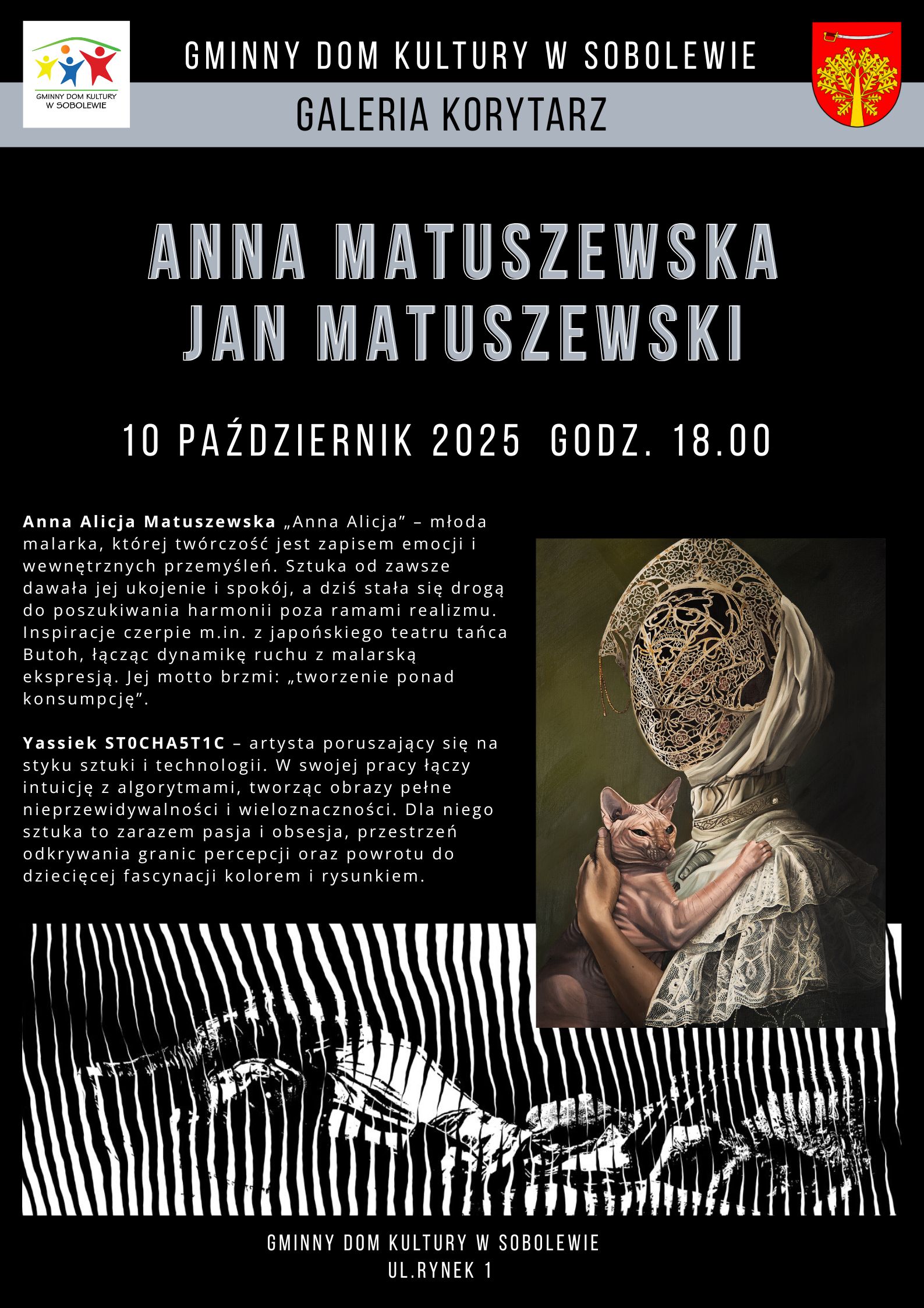 Wernisaż odbędzie się 10 października 2025 roku o godz. 18.00 w Galerii Korytarz Gminnego Domu Kultury w Sobolewie. Wstęp wolny.