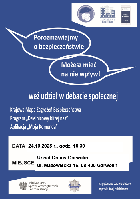 Debaty z Policją to forma nawiązania bezpośredniego kontaktu ze społecznością lokalną i próba wypracowania wspólnych rozwiązań dla problemów zgłoszonych przez mieszkańców. Dlatego serdecznie zapraszamy do wzięcia udziału w wydarzeniu, które odbędzie się w już 24 października 2025 r. o godz. 10:30 w sali konferencyjnej Urzędu Gminy Garwolin (Garwolin ul. Mazowiecka 16).