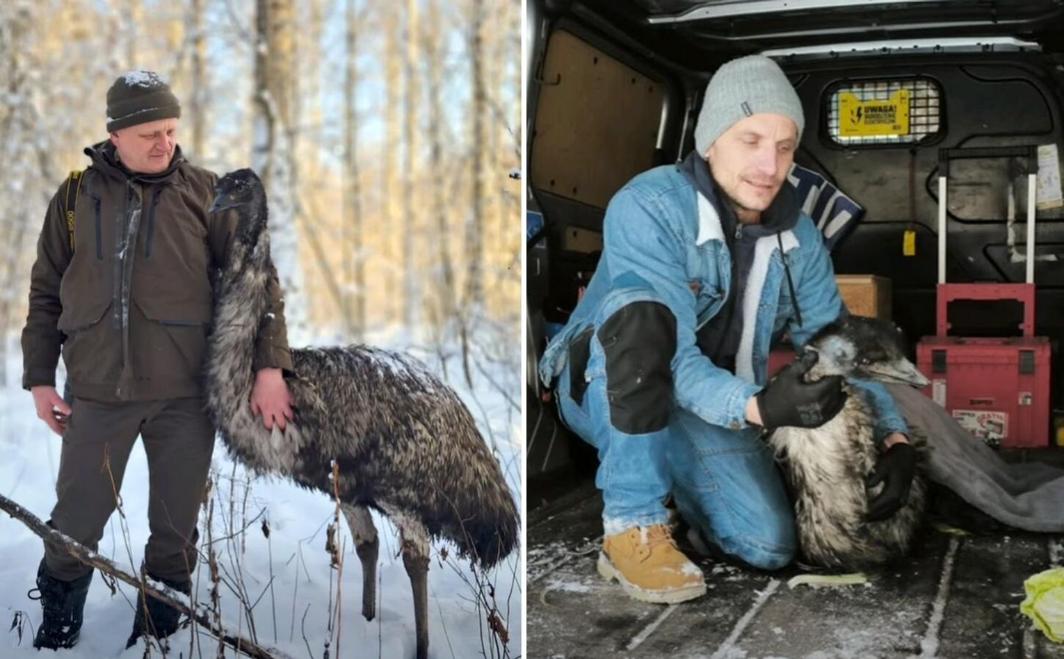 Dopiero dziś rano pracownicy Leśnictwa Huta, idąc „trop w trop po świeżych śladach odciśniętych na śniegu”, dotarli do miejsca, w którym ukrywał się ptak. Okazało się, że to Fabiś – samiec emu, który „dzień wcześniej uciekł z hodowli, przerażony hukiem fajerwerków”. Panika zapędziła go „ponad 3 kilometry w głąb lasu, w zupełnie obce i niebezpieczne dla niego środowisko”.