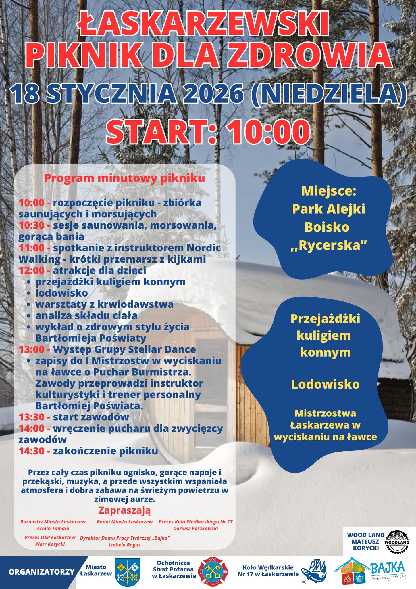 W programie zaplanowano m.in. sesje saunowania i morsowania, gorącą banię, spotkanie z instruktorem Nordic Walking, warsztaty z krwiodawstwa, analizę składu ciała oraz wykład poświęcony zdrowemu stylowi życia. Na uczestników czekać będą również atrakcje dla najmłodszych, lodowisko, przejażdżki kuligiem konnym, a także ognisko, gorące napoje i muzyka, tworzące zimową atmosferę sprzyjającą aktywnemu wypoczynkowi.