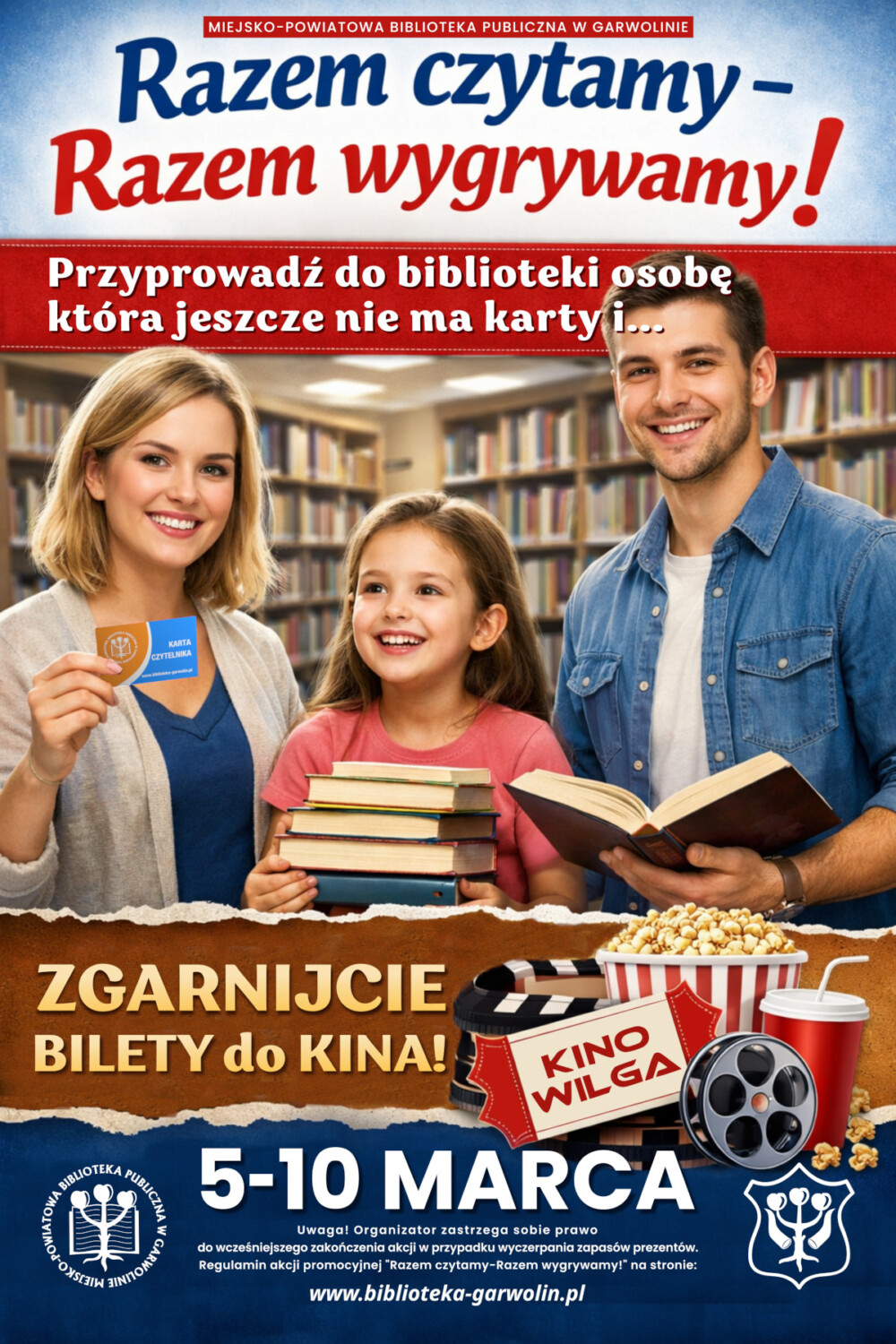 Wydarzenie odbędzie się w dniach 5–10 marca 2026 r., w godzinach pracy Biblioteki, w siedzibie przy ul. Nadwodnej 1 w Garwolinie. Zasady udziału są proste. Każdy posiadacz aktywnej karty bibliotecznej może przyprowadzić do Biblioteki osobę, która nie jest jeszcze jej czytelnikiem. Nowy czytelnik powinien zapisać się do Biblioteki oraz wypożyczyć przynajmniej jedną książkę, audiobook lub film. W zamian zarówno osoba polecająca, jak i nowy czytelnik otrzymają upominek. Na uczestników czekają bilety do Kino Wilga. Liczba prezentów jest ograniczona, dlatego organizatorzy zachęcają do szybkiego udziału w akcji.