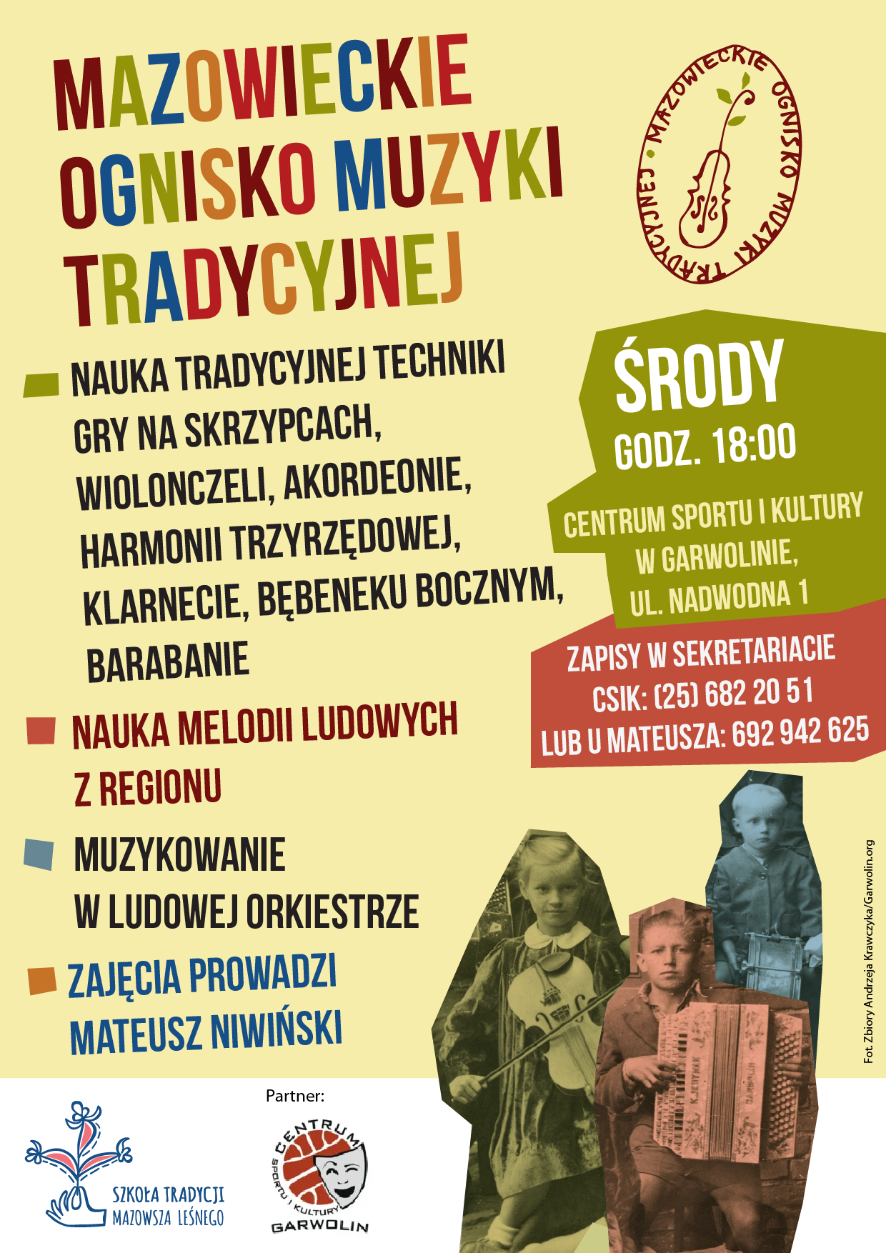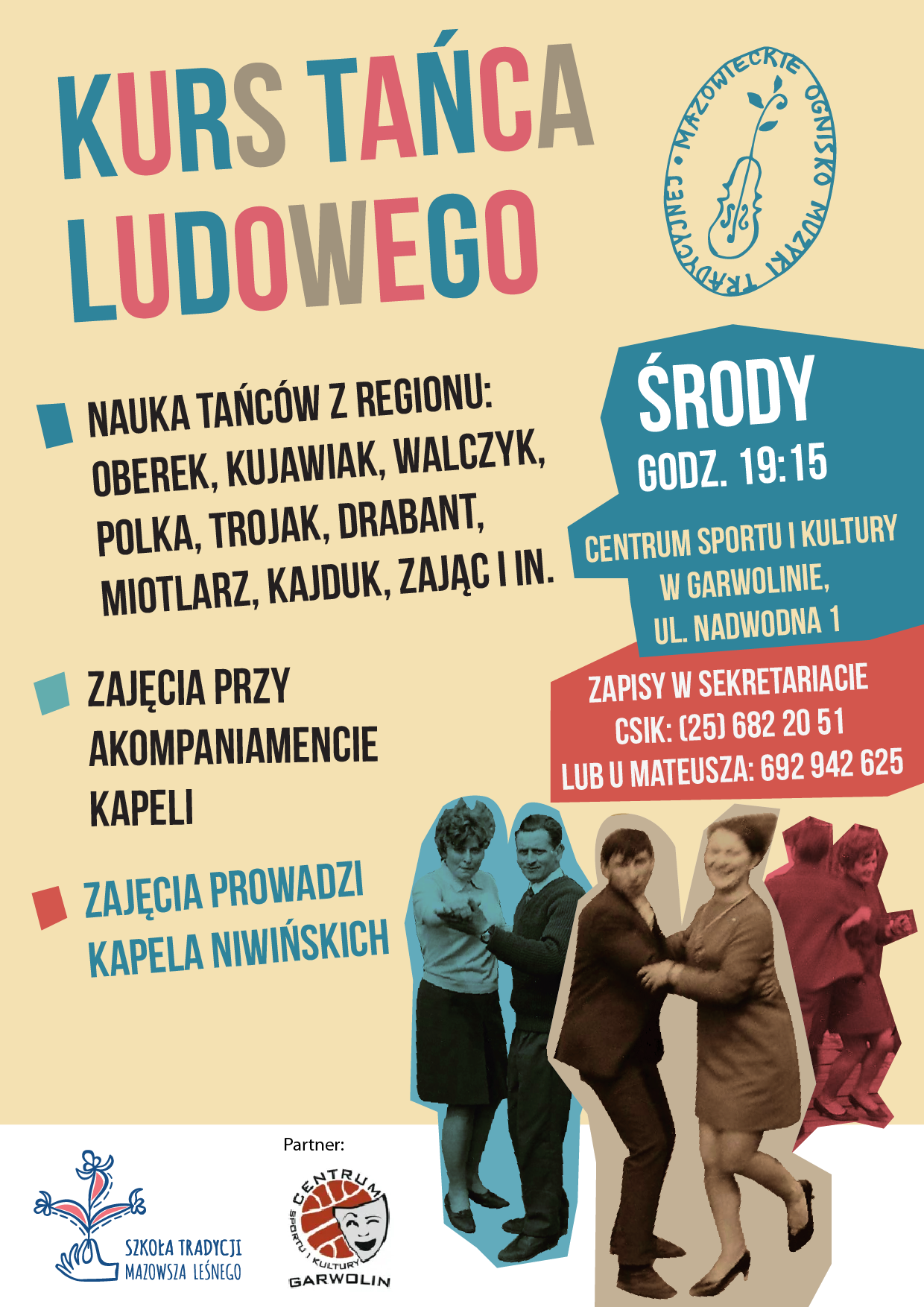 Mateusz i Agnieszka Niwińscy – muzycy i animatorzy kultury tradycyjnej prowadzą już Mazowieckie Ognisko Muzyki Tradycyjnej, a teraz poszerzają swoją ofertę we współpracy z Centrum Sportu i Kultury. Szkoła Tradycji Mazowsza Leśnego to cykl stałych zajęć muzycznych przybliżających kulturę i tradycje muzyczne Mazowsza Południowo wschodniego - nazywanego pod koniec XIX wieku Mazowszem Leśnym, w tym okolic Garwolina i Powiśla Maciejowickiego.
