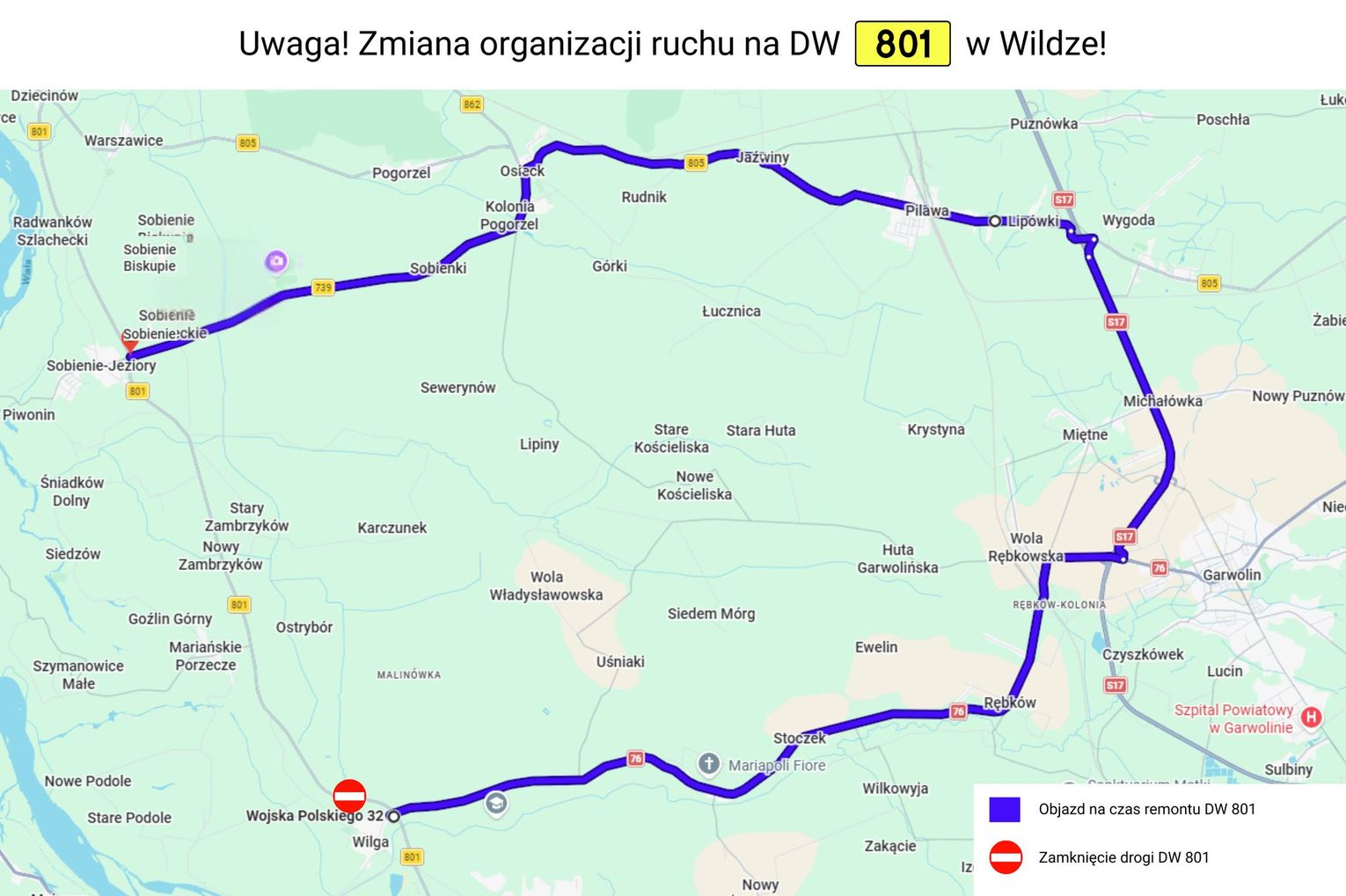 - z Osiecka drogą wojewódzką nr 739 do miejscowości Sobienie-Jeziory, gdzie trasa objazdu wraca na drogę wojewódzką nr 801.