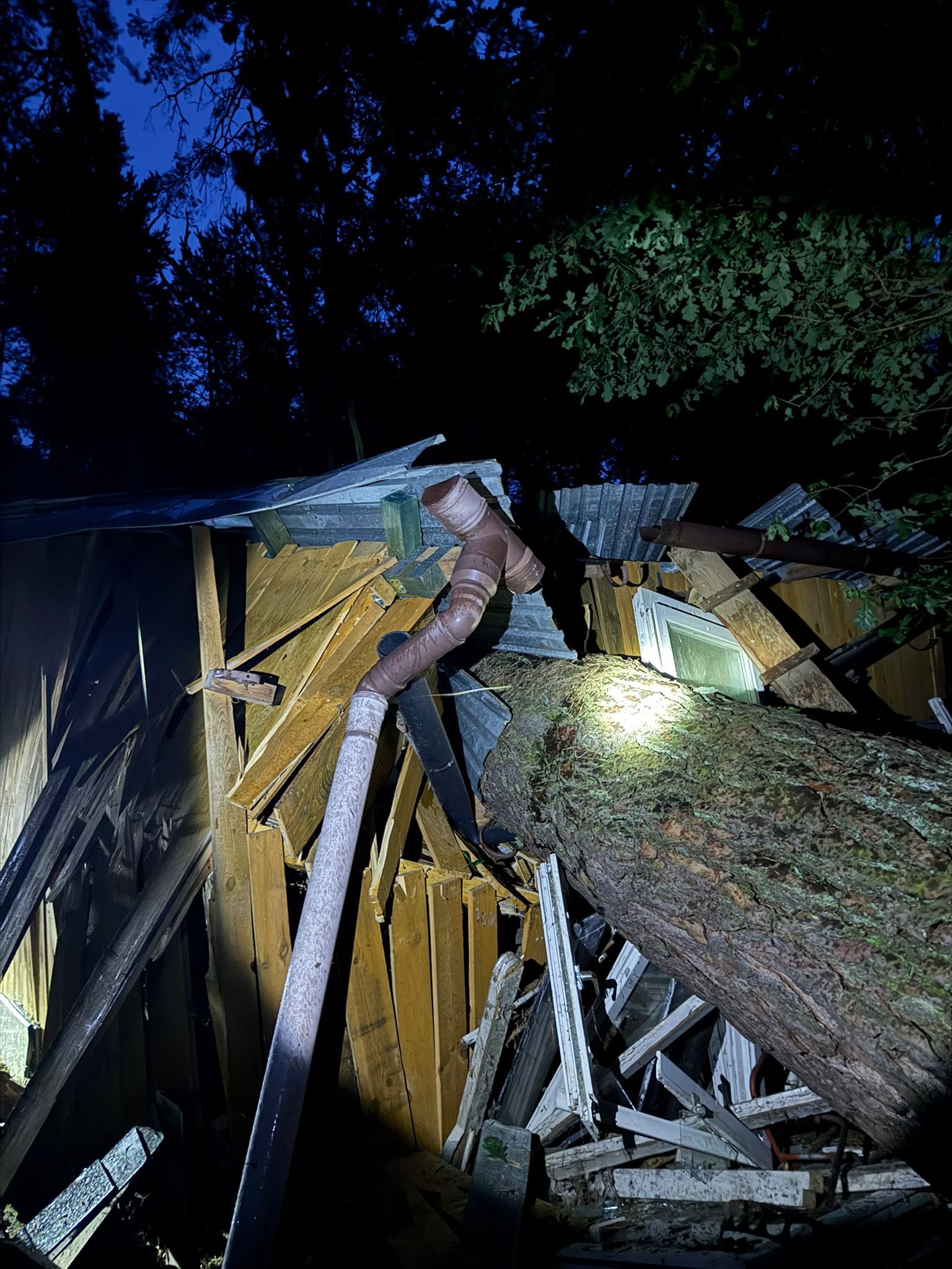 Silny wiatr powalił drzewo na garaż