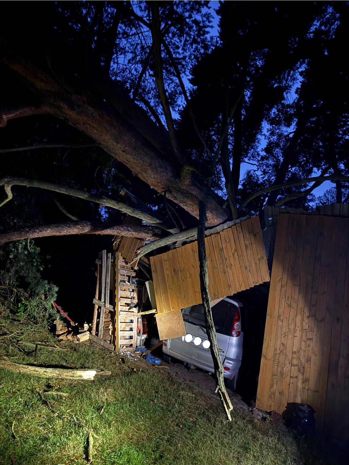 Silny wiatr powalił drzewo na garaż